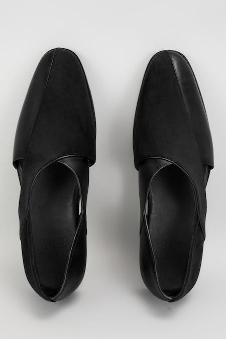 Black peshawari sandal featuring criss cross strap design and almond toe detailing