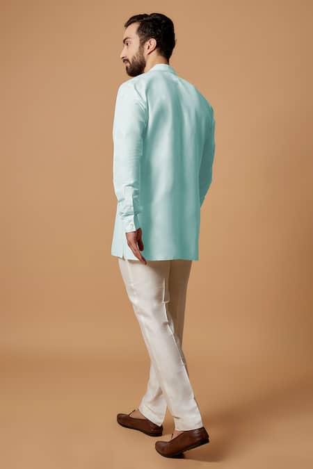 Sky blue kurta featuring a pintucked mandarin collar and full sleeves