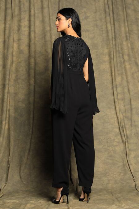 Black jumpsuit in hand embroidered sequin work with plisse shoulder drapes and side pockets.