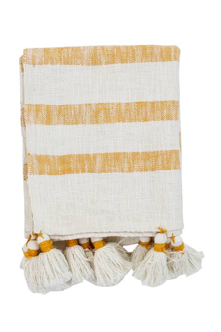 Yellow bunai throw in a woven texture base with striped pattern & fringed hem.