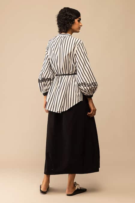 Black Cotton Embroidery Round , Button-down Asha Stripe Pattern Shirt