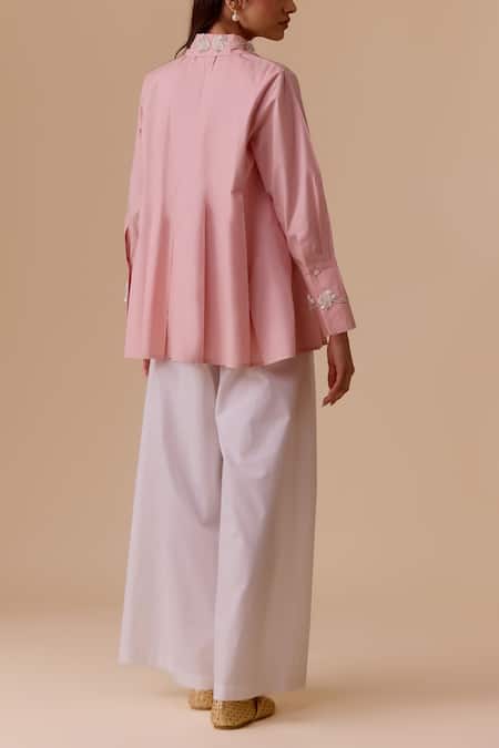 Embroidery details on collar and cuffs, Pleated design for added structure