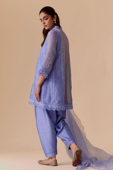 Blue kurta set featuring floral embroidery with lace and bead details. Paired with a matching dupatta and salwar made from silk organza and viscose silk.