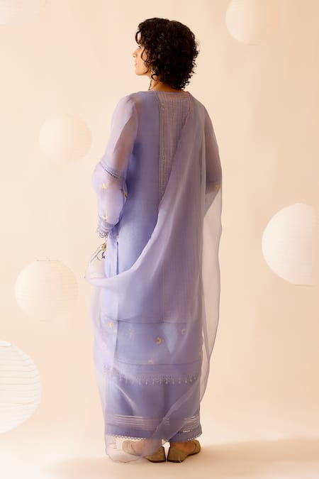 Purple straight kurta featuring floral thread embellishment with bead lace detailing on the hem. Paired with a lace detailed wide leg pant and a sheer dupatta.
