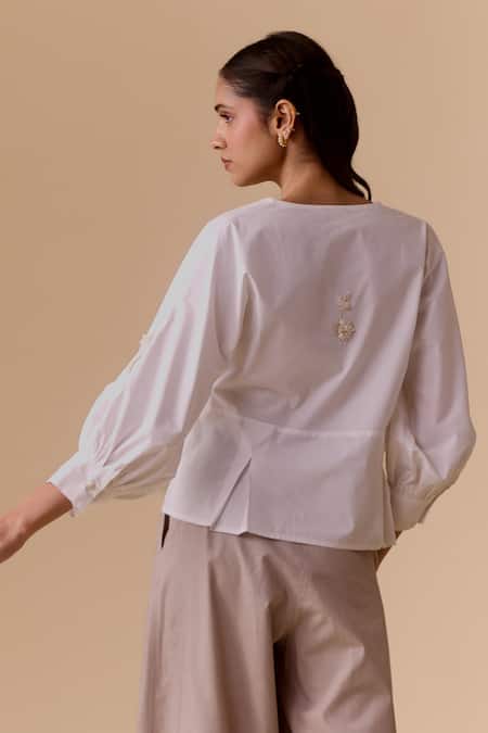White cotton poplin top featuring intricate embroidered patches and a flattering silhouette