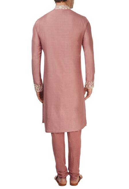 Pink kurta with floral embroidered placket, band collar and cuffs. Comes with pant.