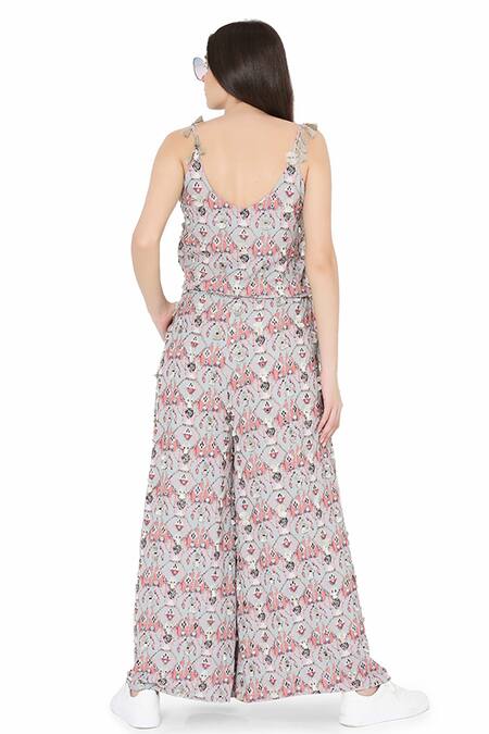 Grey strappy jumpsuit in geometric butterfly prints, embroidered & tassel details with drawstring tie-up.