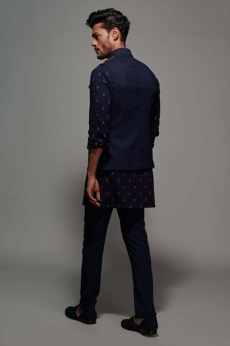 Navy blue Nehru jacket with faux leather belt on the waistband and shoulders.