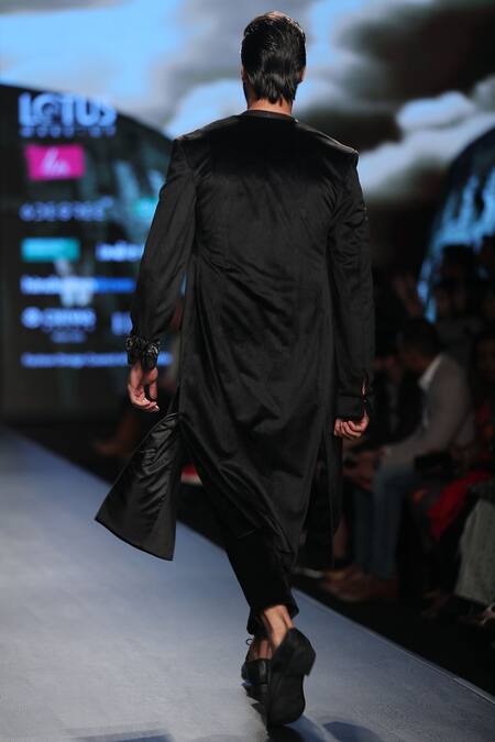 Charcoal button-front long sherwani jacket. Comes with a light-grey waist-coat and matching trousers.