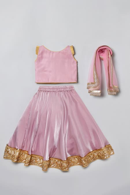 Pink lehenga featuring floral and sequins embroidery with a golden blouse. Paired with a matching dupatta, this set is crafted from glass tissue fabric.