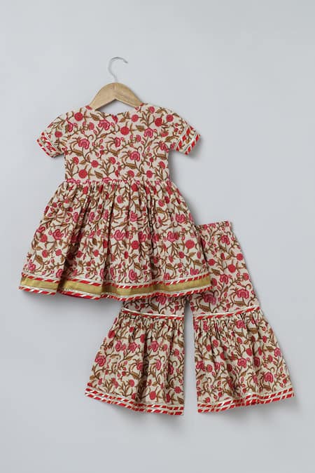 Multi colored floral print anarkali kurta featuring a V neckline and short sleeves. Paired with an elasticated waistband sharara and a coordinating dupatta.