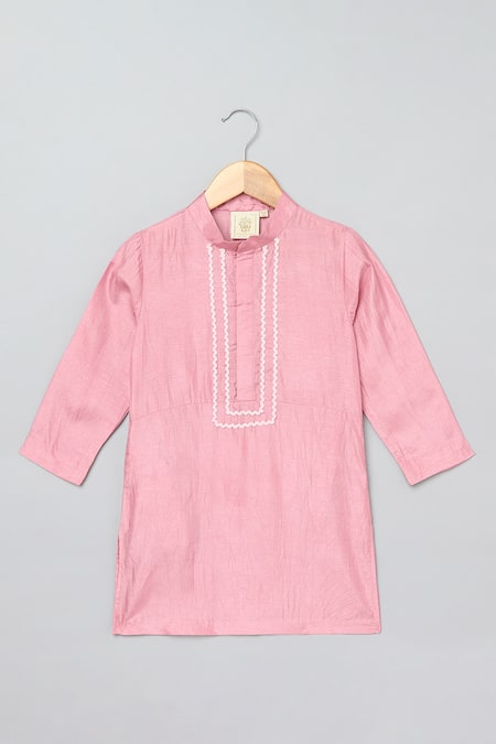 Dusty pink bundi featuring floral zari and beads embroidery. Paired with a kurta with cutwork lace embroidered placket and solid pyjama.