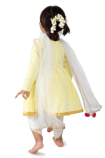 Lime green kurta featuring pom-pom embellishments and full sleeves. Paired with asymmetric dhoti pant and dupatta.