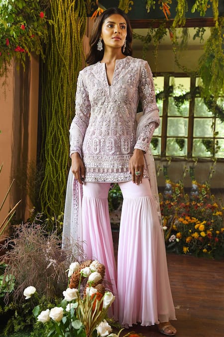 Pink short net kurta with mirror patra work, embellished bead-Swarovski & zardozi handwork. Comes with sharara pants & sheer dupatta.