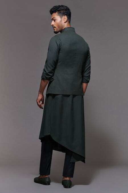 Green Nehru jacket with camo jacquard detailing and front flaps.