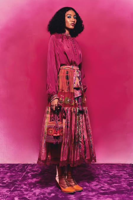 Fuchsia Silk Embroidery, Patchwork Amala Skirt