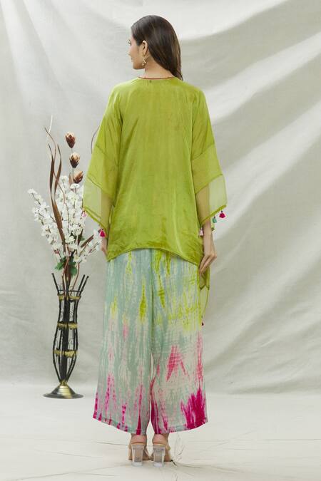 Olive green tunic with embroidery on the waist and asymmetrical hem. Comes with tie dye palazzo.