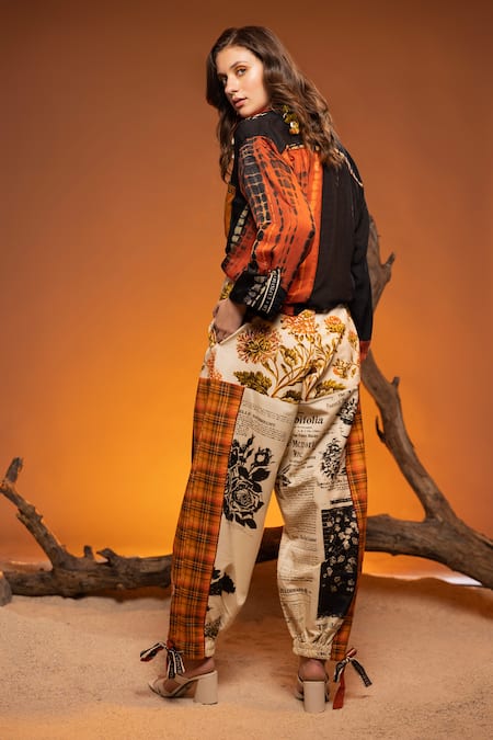 Ivory and orange cargo pant featuring botanical print and patchwork embroidery