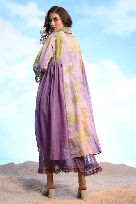 Lavender cotton flared tunic featuring a V neck and three-quarter sleeves. Paired with a long frilled inner and a stole, both in a matching hue.