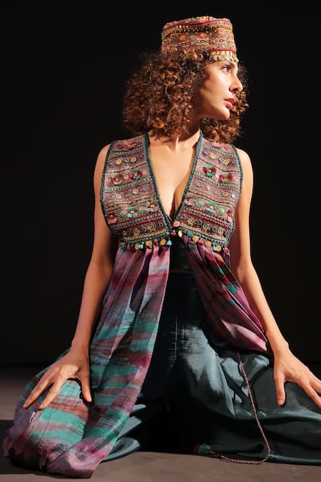 Purple and turquoise blue embroidered cowl cape featuring a V neck and sleeveless design. Paired with a tie-dye pattern corset blouse and dhoti pant.