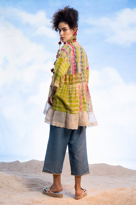 Cream Cotton, Jersey Lace V-neck Franze Tie-dye Print Flared Top