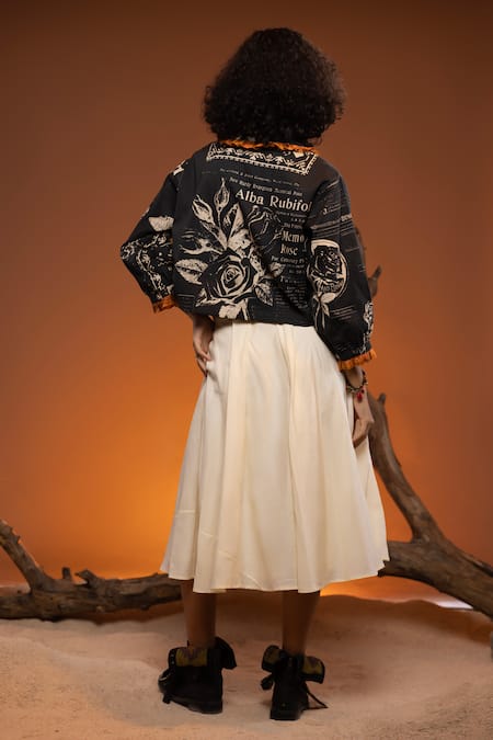 Black cotton shirt featuring abstract print, collar neck, and front button closure