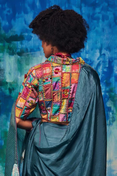Multi color saree blouse featuring patchwork and aari embroidery with a collared neckline and elbow sleeves