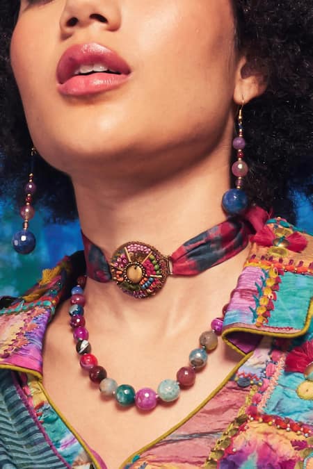 Multi Color Maka Bead Circle Embellished Tie Dye Strap Choker