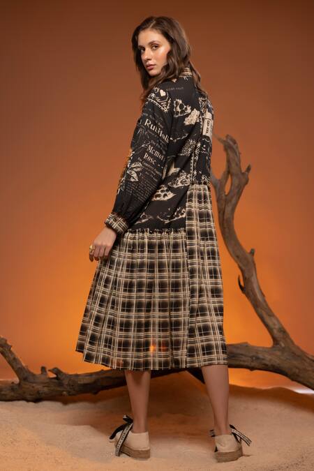 Black Cotton Embroidery Collared Manara Abstract Print Dress
