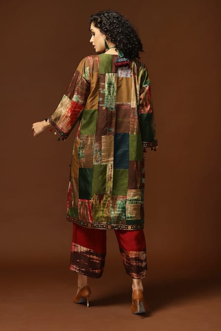 Gold, multicolour patchwork long jacket with tie and dye print and embroidered border.