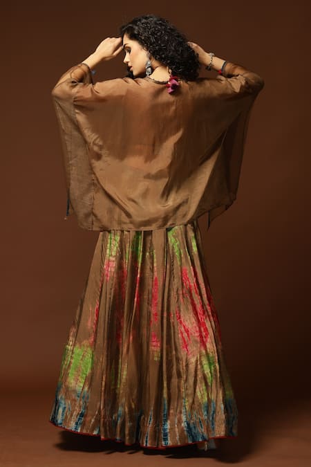 Buy_Capisvirleo_Gold Habutai Silk Sequin, Thread And Bead, Tie & Dye V Poncho Style Top With Skirt _Online_at_Aza_Fashions