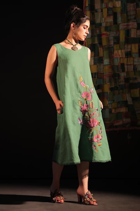 Green Linen Embroidery Round Neck Raashi Thread Dress