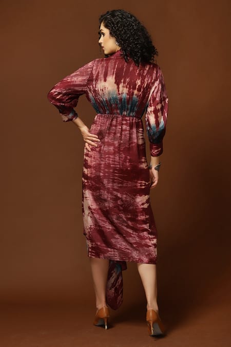 Burgundy, blue midi dress with tie and dye print, asymmetrical hem and overlapping V neckline.