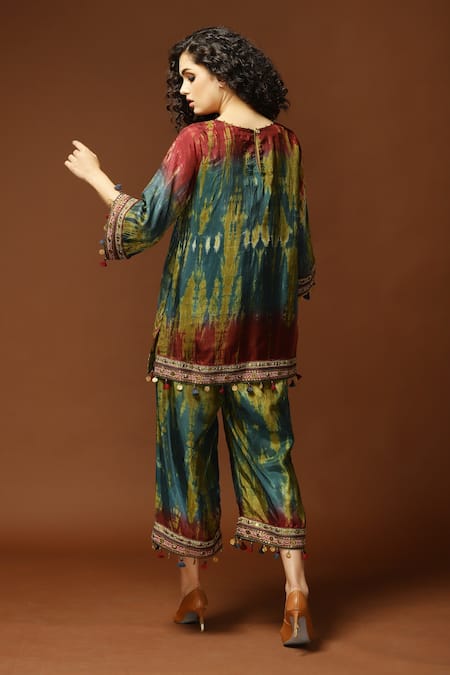 Teal, olive short tunic with tie and dye print and embroidered hems. Comes with palazzo pants and dupatta.