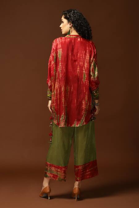 Red, olive shirt style tunic with tie and dye print and embroidery on the cuffs. Comes with straight pants.