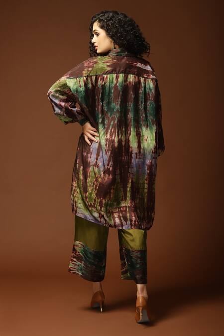 Brown, olive green shirt style tunic with tie and dye print and high low hem. Comes with straight pants.