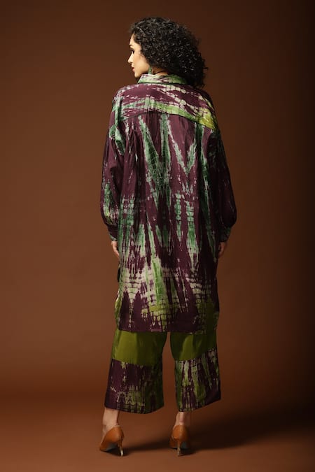 Burgundy, olive green shirt style tunic with tie and dye print and high low hem. Comes with straight pants.