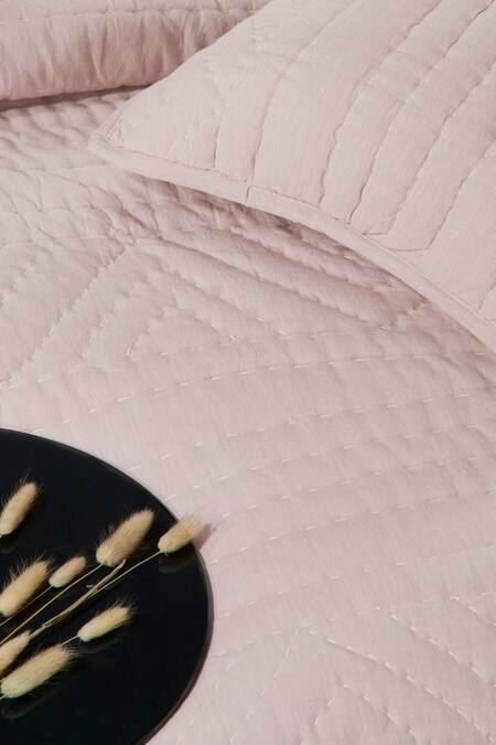 Pink quilted bedspread with stitchline embroidery in geometric pattern. Comes with pair of rectangle shaped pillow cover.