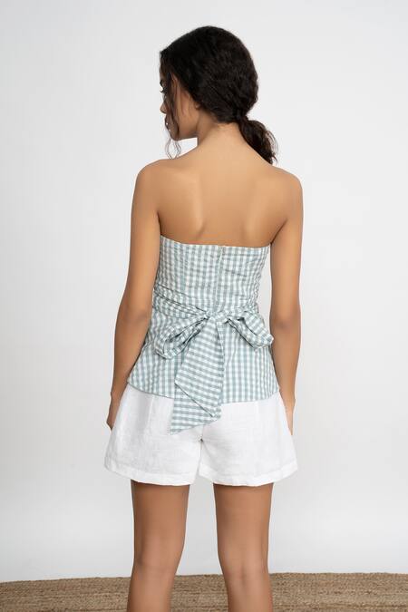 Blue Cotton, Linen Lace Square Capri Coast Checkered Pattern Top And Short Set