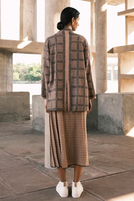 Brown Handloom Cotton Collared Carbon Checkered Pattern Jacket