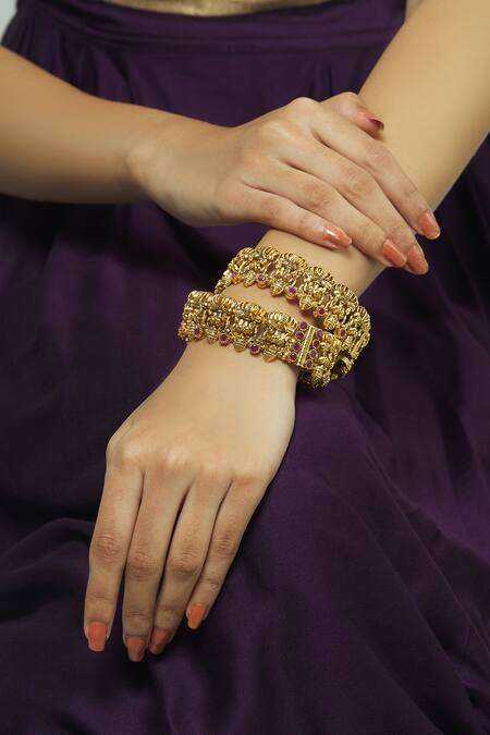Antique gold-plated bangles & goddess carved bangles embellished with pink stones.