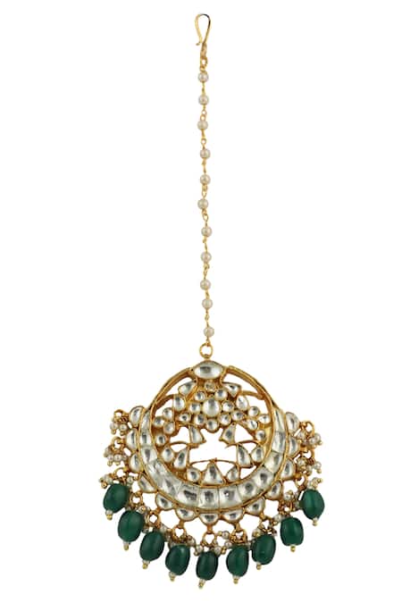 Gold maangtikka featuring carved motifs, cluster bead drops, and jadtar stones