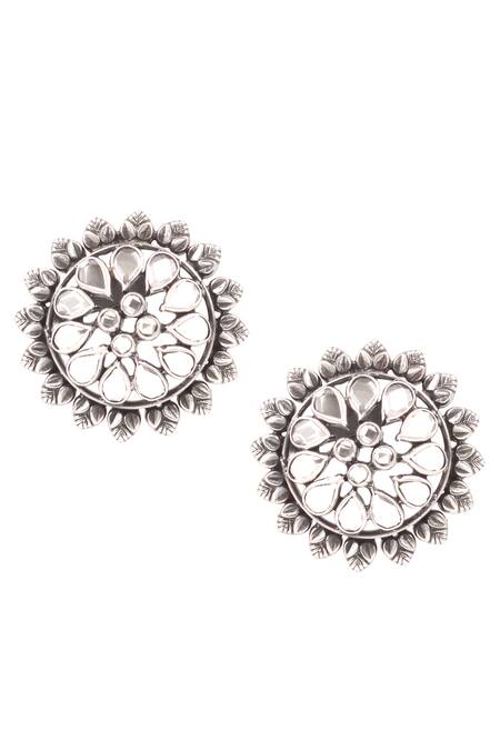 Silver stud earrings featuring a round shape adorned with gemstones and a leaf motif hem