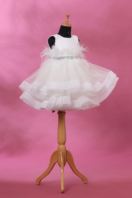 Buy_Casa Ninos_White Cotton, Net Feathers Embellished Ruffled Dress _Online_at_Aza_Fashions