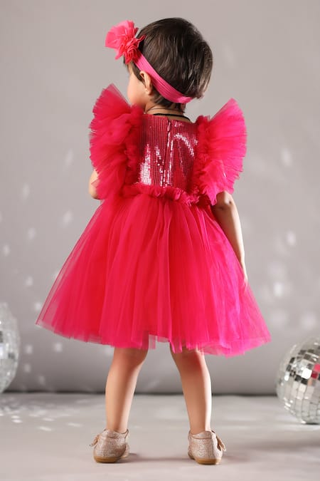 Buy_Casa Ninos_Fuchsia Net Sequins Ruffle Sleeve Dress _Online_at_Aza_Fashions