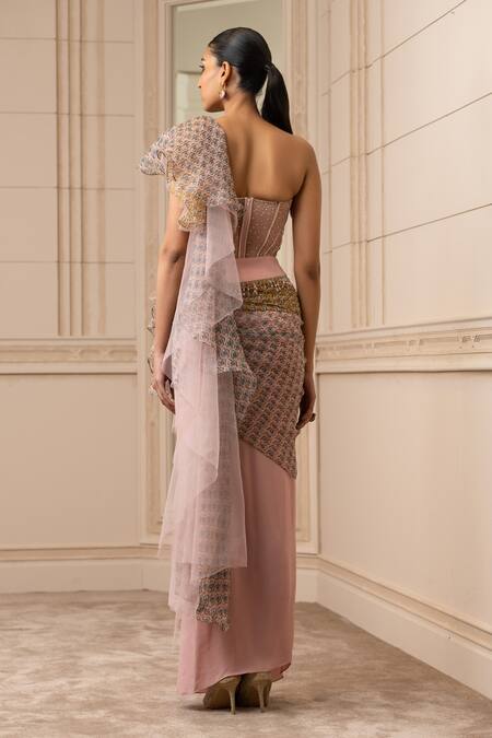 Buy_Tarun Tahiliani_Pink Concept Saree Georgette, Foil Jersey, Sheer Silk Cascade Draped With_at_Aza_Fashions