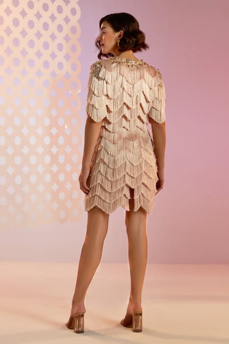 Beige fringe dress in tiered chevron motifs and hand embellished shoulders.