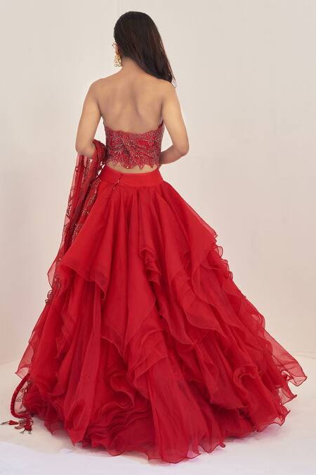 Red Raw Silk, Organza Bandeau Cascade Lehenga Set