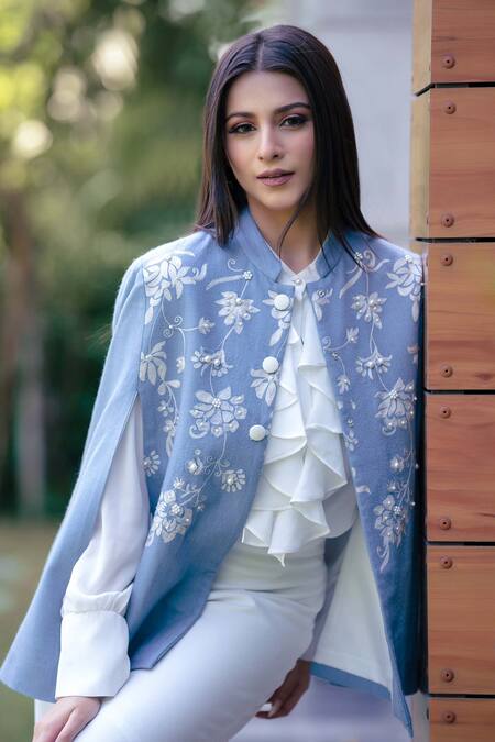 Sky blue cape embellished with pearls and hand embroidered flower vines.