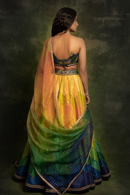 Multi color dupion multi panel lehenga with chevron pattern, mirror & zari embroidery. Paired with brocade plunged V neck blouse with floral pattern, embroidered border & organza dupatta with all over gold foil print.